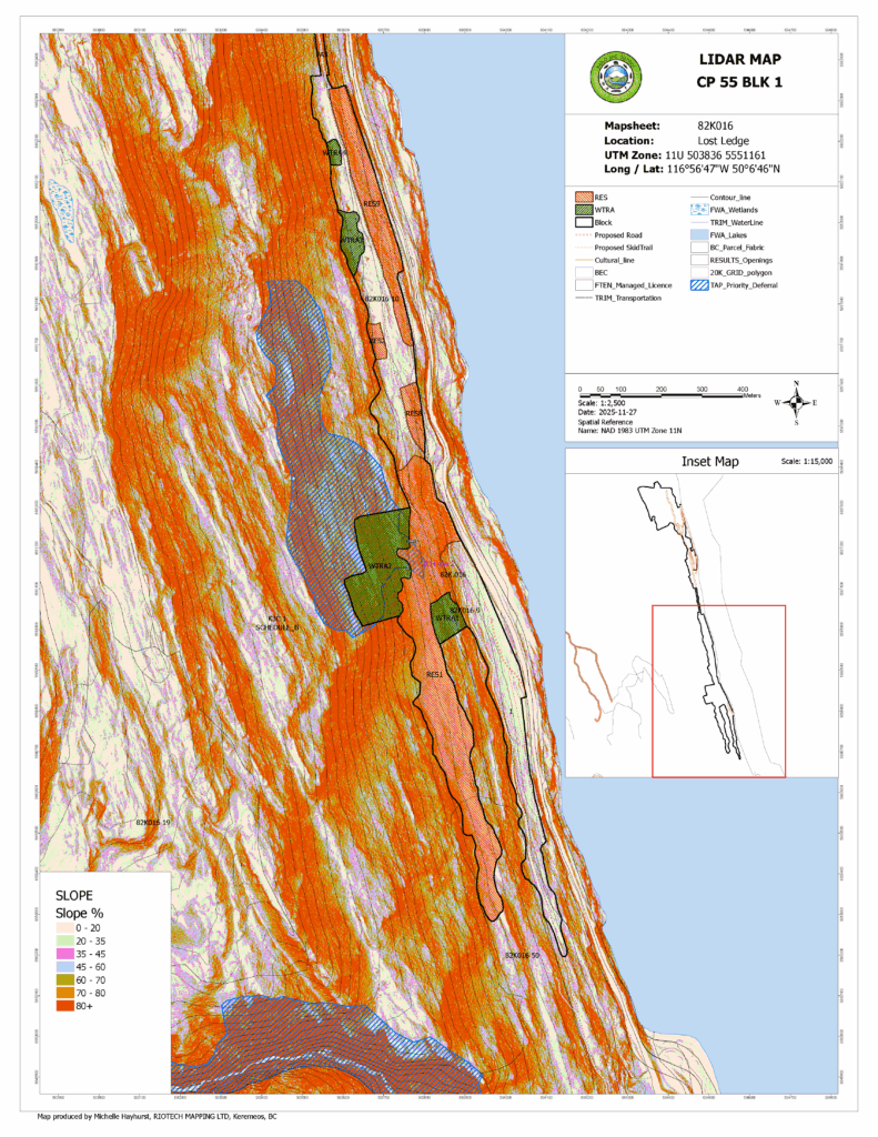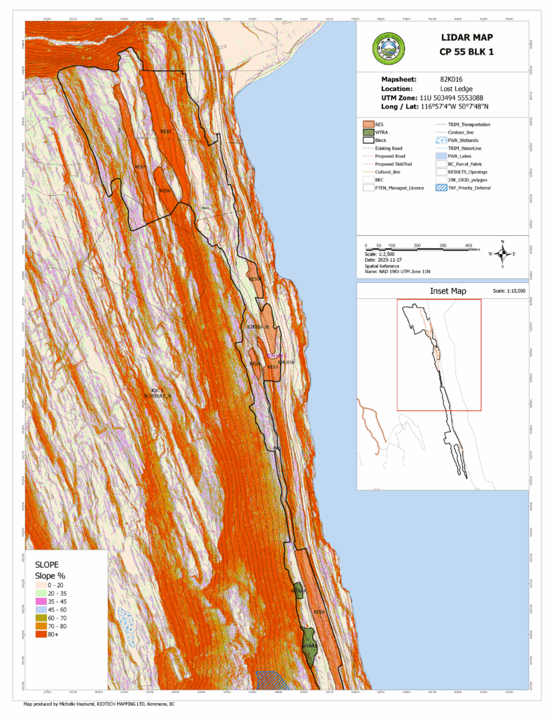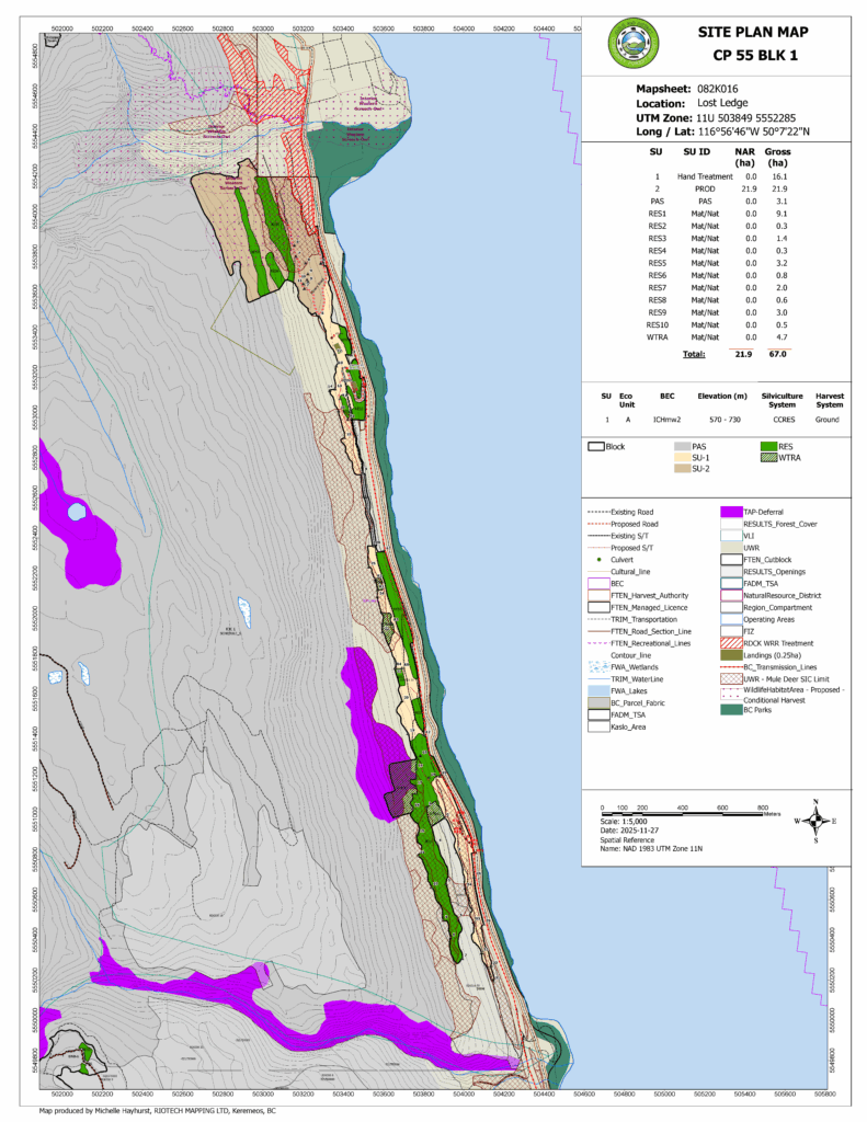 This project was initiated due two forest fires starting near Schroeder Creek in the past 15 years by trees falling on the power lines, which luckily didn’t spread too far thanks to the efforts of the KVFD and BCWS. The project includes 14ha of manual treatment above Lardeau, and 20ha of mechanical stretching from just north of the Lost Ledge campground to Lardeau.